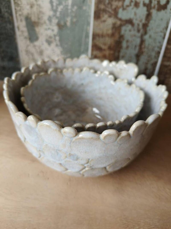 Set van potjes in verschillende afmetingen, ideaal om je aperitiefhapjes dat tikkeltje meer te geven. Ze kunnen ook gebruikt worden om koekjes en pralines in te serveren. Of als serveerschaal voor slaatjes, tomaatjes,...tijdens een bbq. De turquoise set bestaat uit 3 potjes, de blauwe uit 3.