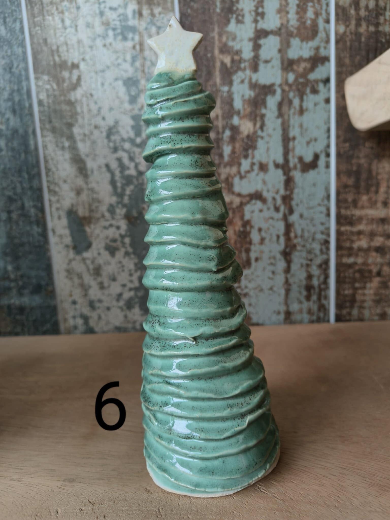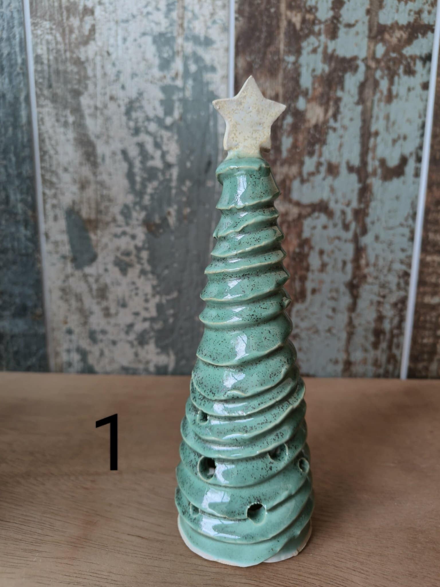 Kerstboompjes in keramiek. Elk boompje is uniek. Er zijn 3 hoogtes verkrijgbaar. De kleinste zijn ongeveer 19 cm hoog. Deze hebben kleine gaatjes. Onder de boompjes kun je een ledkaarsje plaatsen zodat het licht via de gaatjes naar buiten komt. De middelgrote boompjes zijn plusminus 24 cm. De hoogste zijn ongeveer 29 cm hoog. Hoogtes en kleuren kunnen licht afwijken van de foto's.